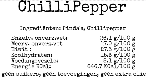 Finely ground American peanuts with biological chili powder medium heat (13.000 SCU). No added sugar, No additives, No extra oil.