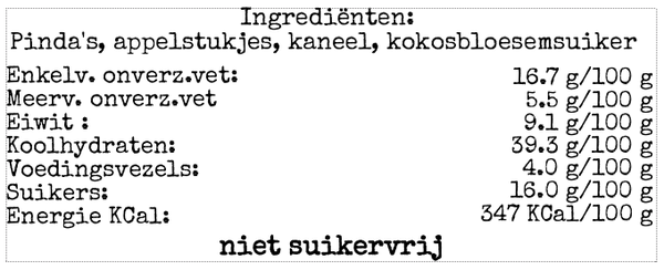 Een unieke combinatie van romige pinda’s, harde appelstukjes en warme kaneel, met een vleugje kokosbloesemsuiker voor een subtiele, natuurlijke zoetheid. Deze pindakaas heeft een volle, nootachtige smaak met een kruidige twist en een lichte bite van de appel.