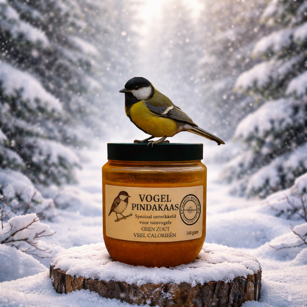 In de tuin hangt een vrolijk potje van De Pindakaaspot. Geen gewone pindakaas, maar vogelpindakaas: speciaal gemaakt zonder zout en suiker, precies zoals de vogels het graag hebben. Terwijl de zon langzaam opkomt, fladderen de eerste koolmeesjes nieuwsgierig rond het potje. Even later sluiten roodborstjes, mussen en zelfs een specht zich aan.